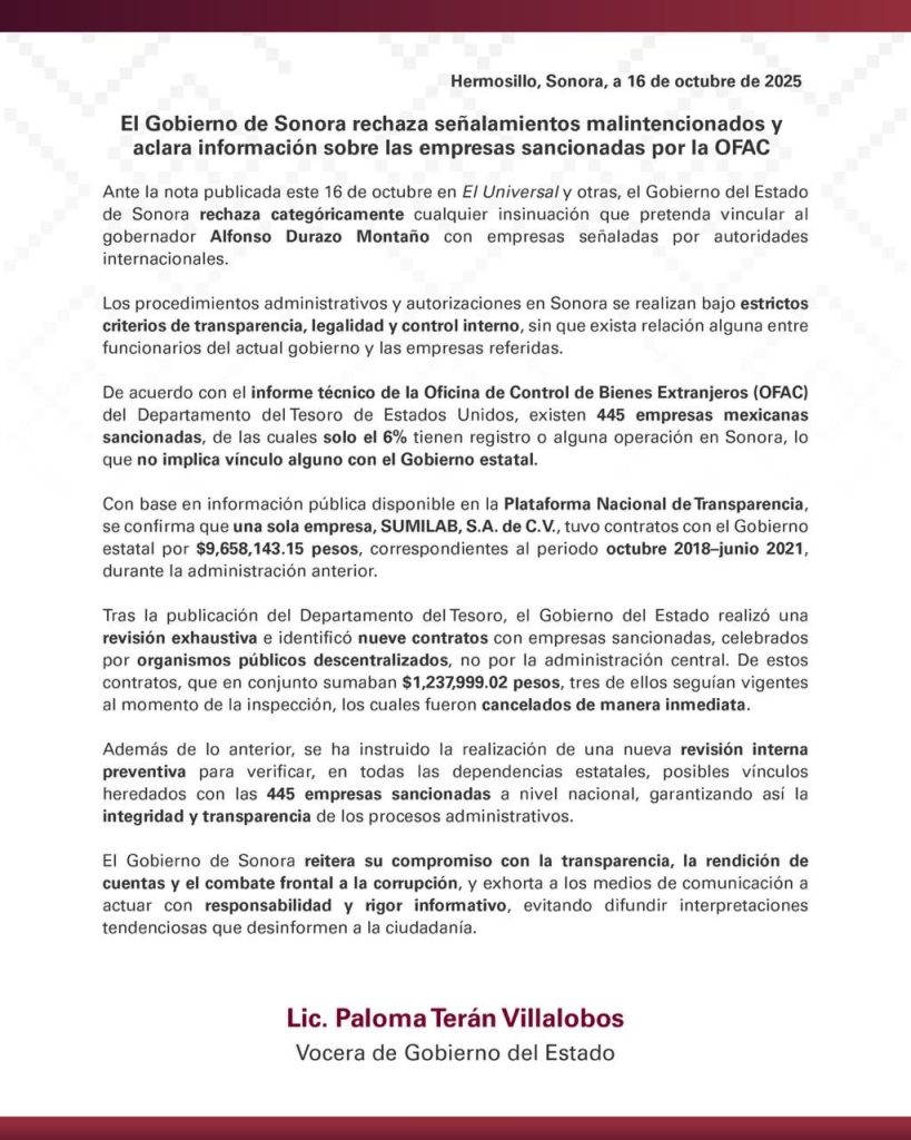 El documento precisa que, de las 445 empresas mexicanas sancionadas por la OFAC, solo el 6 por ciento tienen registro o alguna operación en Sonora, lo que “no implica vínculo alguno con el Gobierno estatal”.