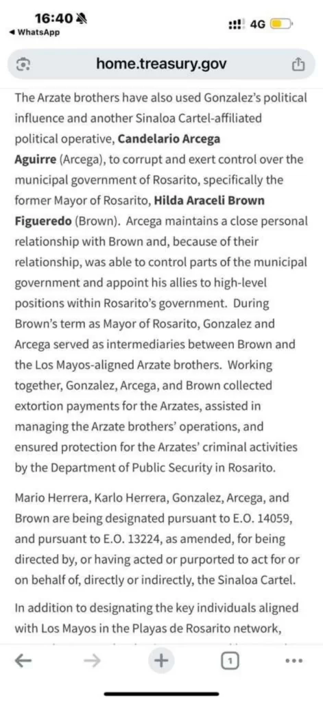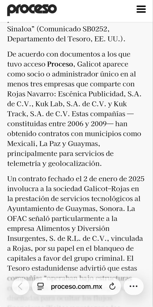 Un contrato fechado el 2 de enero de 2025 involucra a la sociedad Galicot–Rojas en la prestación de servicios tecnológicos al Ayuntamiento de Guaymas, Sonora. La OFAC señaló particularmente a la empresa Alimentos y Diversión Insurgentes, S. de R.L. de C.V., vinculada a Rojas, por su papel en el blanqueo de capitales a favor del grupo criminal. El Tesoro estadunidense advirtió que estas compañías “operaban bajo estructuras corporativas aparentemente legales, diseñadas para ocultar los flujos financieros ilícitos y proteger a los verdaderos beneficiarios”.