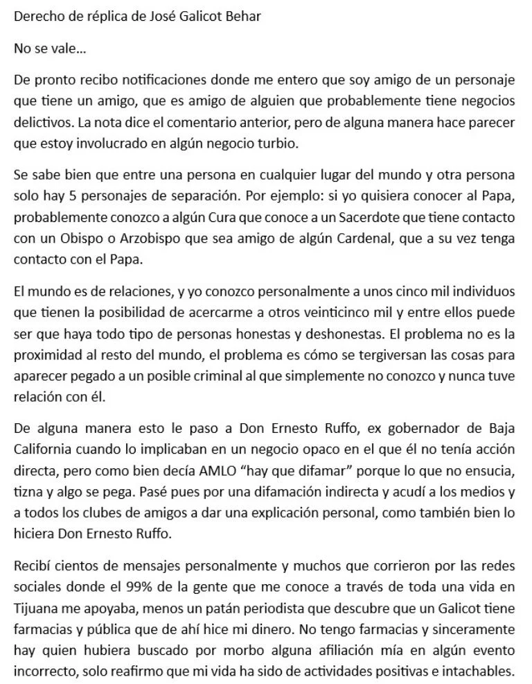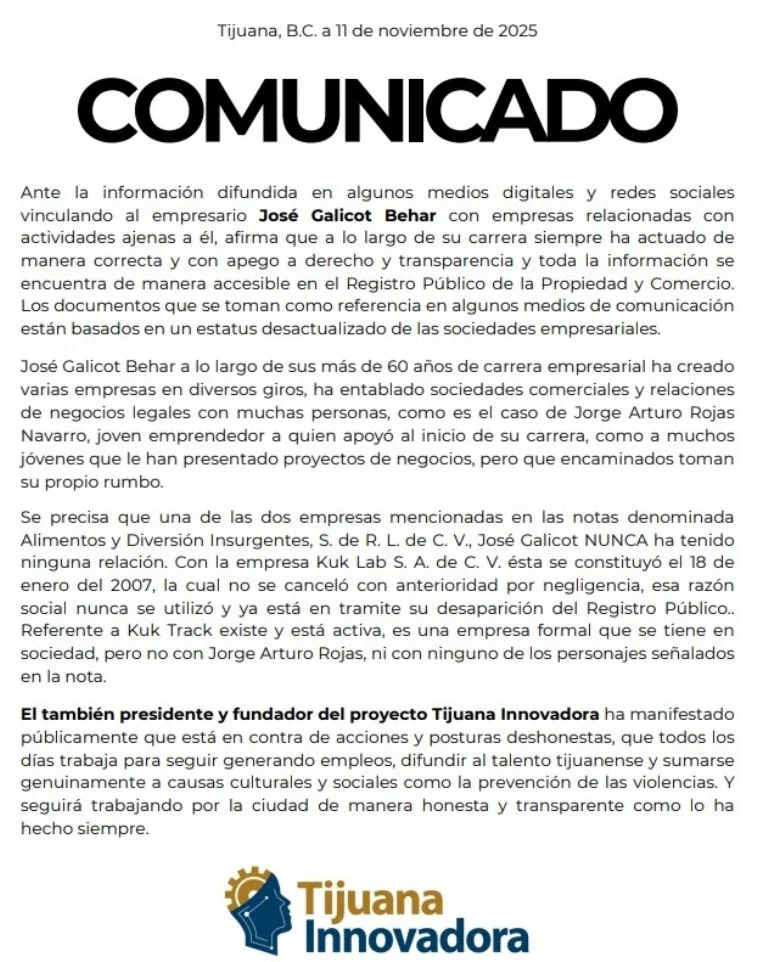 Una serie de documentos y registros empresariales apuntan a que José Galicot Behar, reconocido empresario tijuanense y figura pública por su labor filantrópica, mantiene vínculos societarios con Jorge Arturo Rojas Navarro, uno de los hombres recientemente sancionados por el Departamento del Tesoro de Estados Unidos por presuntas operaciones de lavado de dinero ligadas al Cártel de Sinaloa.