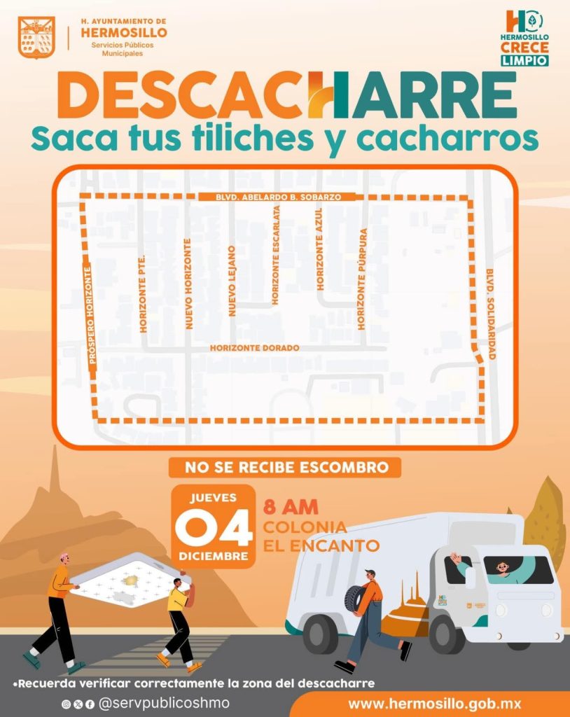 El jueves 4 de diciembre residentes del cuadrante entre las calles Próspero Horizonte, bulevar Solidaridad y Horizonte Dorado, de la colonia El Encanto, podrán beneficiarse de la jornada de descacharre programada a partir de las 8:00 horas de ese día.