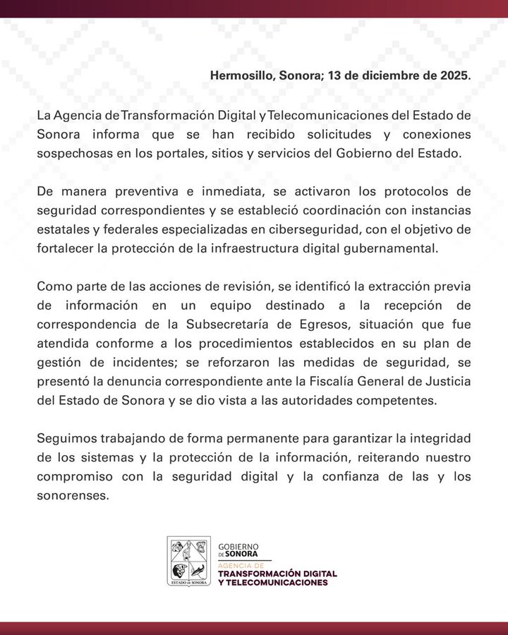 De acuerdo con el comunicado emitido este 13 de diciembre de 2025, se estableció coordinación con instancias estatales y federales especializadas en ciberseguridad, con el objetivo de reforzar la protección de la infraestructura digital gubernamental.