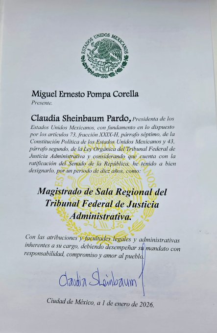 La presidenta de México, Claudia Sheinbaum Pardo, ha designado oficialmente al sonorense Miguel Ernesto Pompa Corella como Magistrado de Sala Regional del Tribunal Federal de Justicia Administrativa (TFJA).
