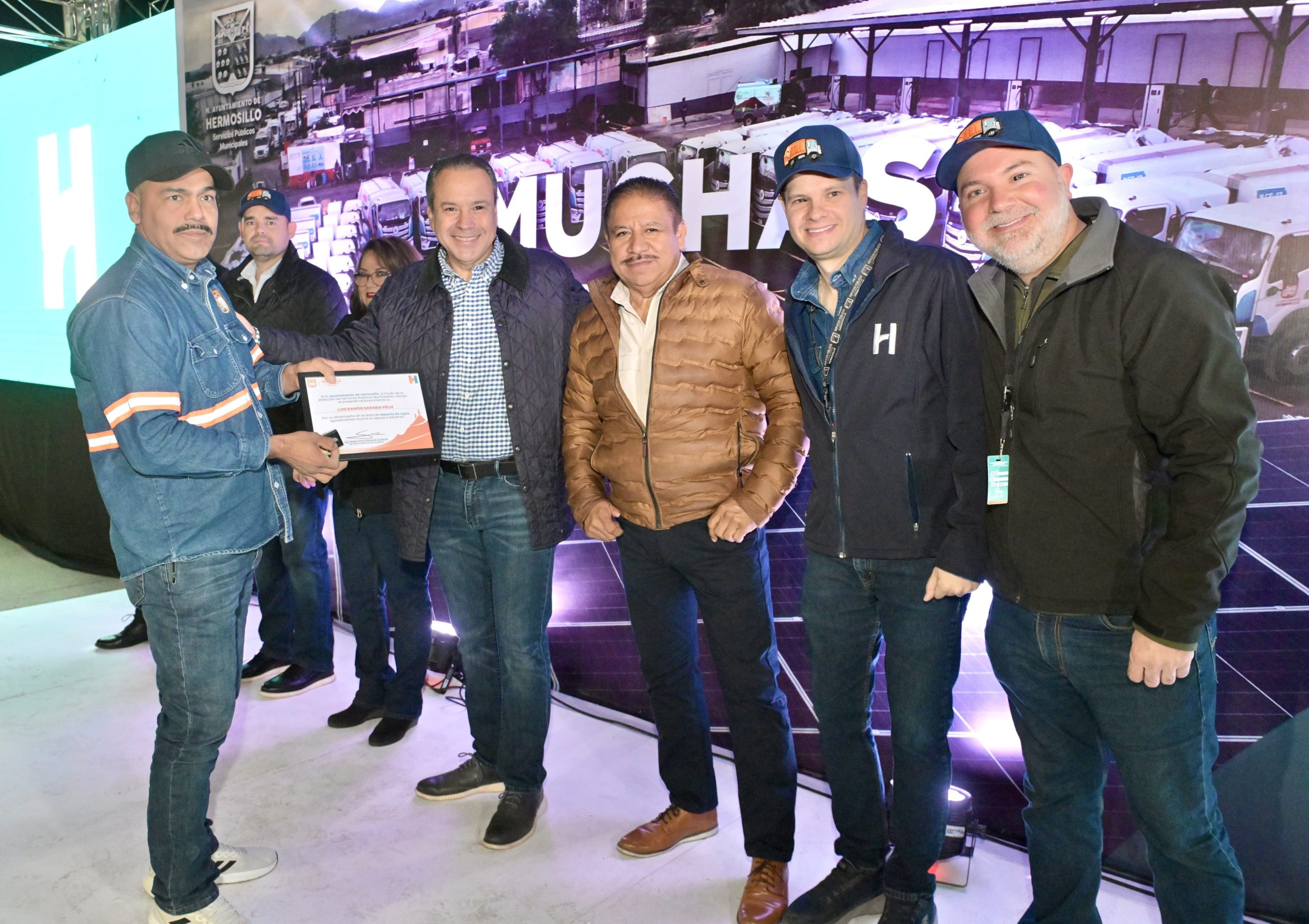 Los acompañaron el Secretario del Ayuntamiento, Eduardo Acuña Padilla; Jovita Monge Noriega, secretaria general del Sindicato Auténtico Independiente de los Trabajadores al Servicio del Ayuntamiento de Hermosillo; Daniel Urias Rodríguez, secretario general del Sindicato Trabajadores del Municipio de Hermosillo; y Salvador Díaz Olguín, secretario general del Sindicato Único de Trabajadores al Servicio del Municipio de Hermosillo.