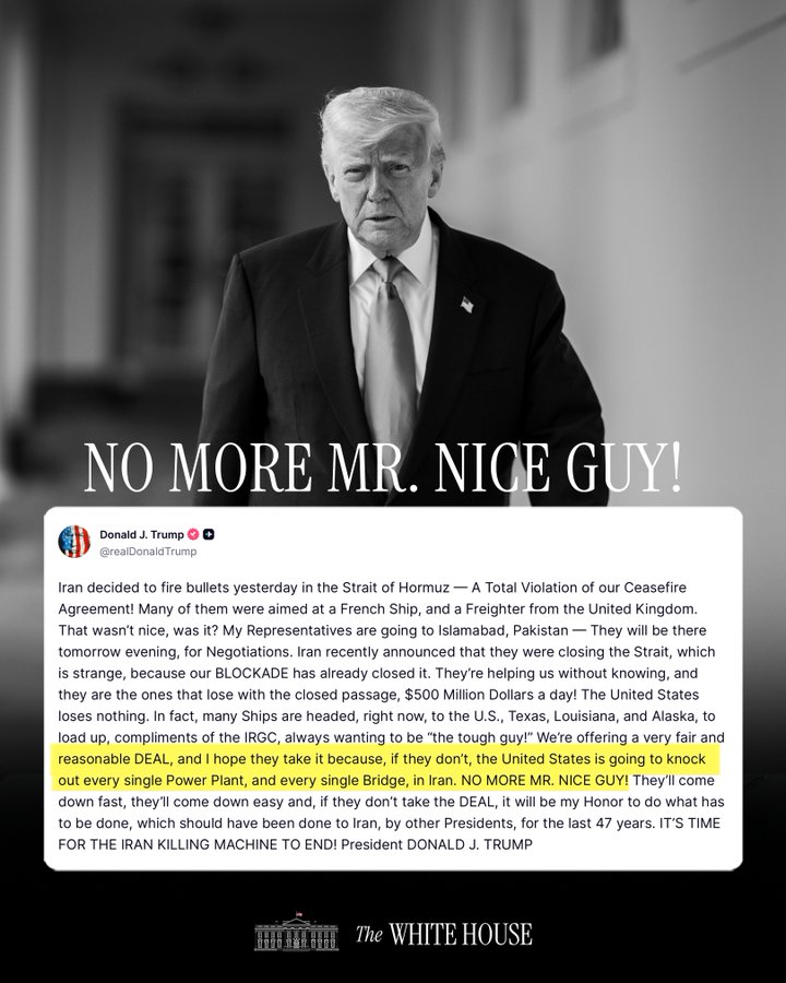 “…Estamos ofreciendo un ACUERDO muy justo y razonable, y espero que lo acepten porque, si no lo hacen, Estados Unidos va a destruir cada Central Eléctrica y cada Puente en Irán. SE ACABÓ EL SEÑOR BUEN CHICO…” – Presidente Donald J. Trump
