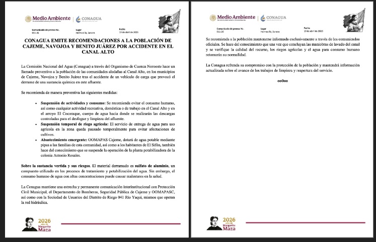 Cajeme, Sonora. – La Comisión Nacional del Agua (Conagua) emitió un aviso urgente de prevención para los habitantes de las comunidades aledañas al Canal Alto y el arroyo El Cocoraque, luego de que un vehículo de carga sufriera un accidente que resultó en el derrame de una sustancia química en el cuerpo de agua.